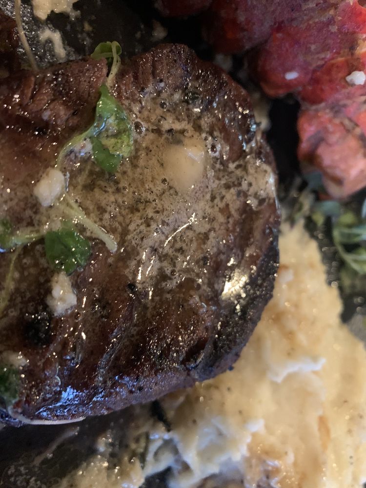 Baked mac-n-cheese, grilled asparagus, garlic demi.